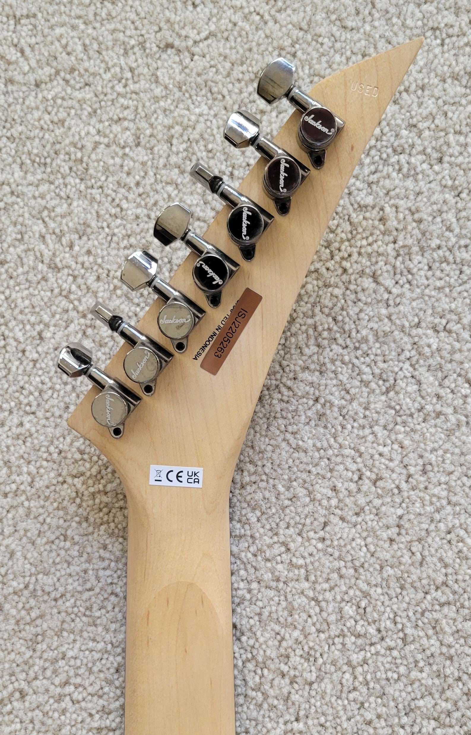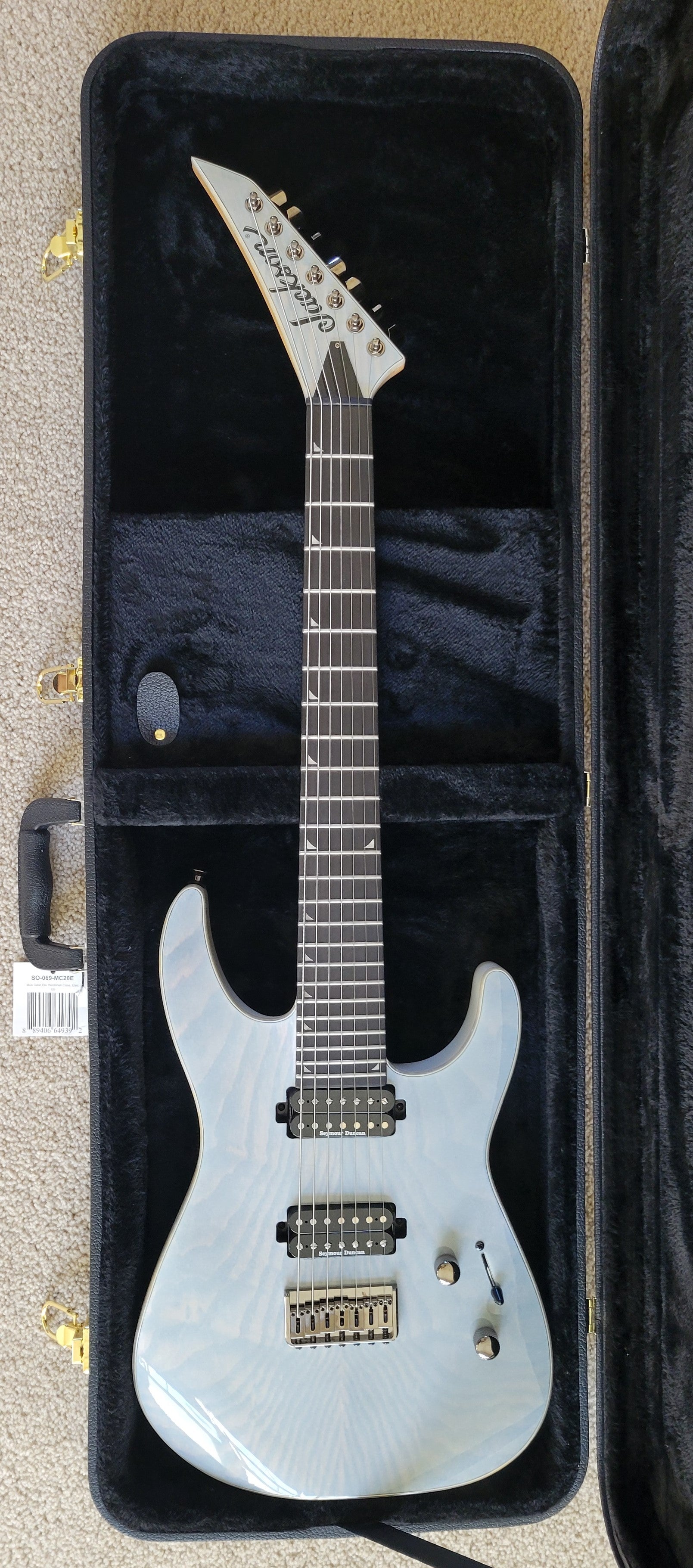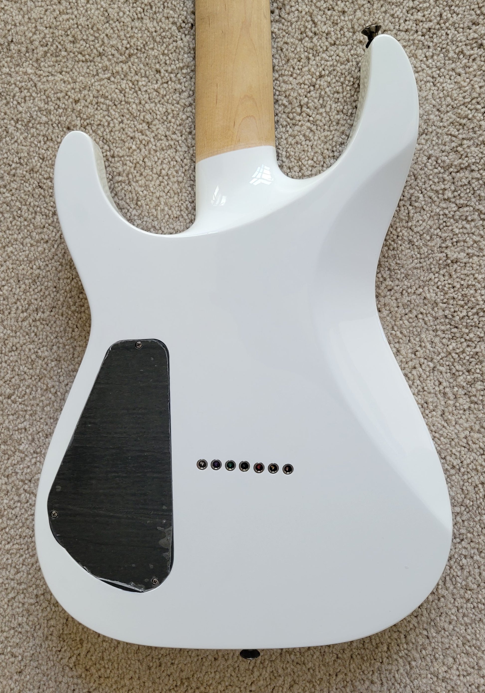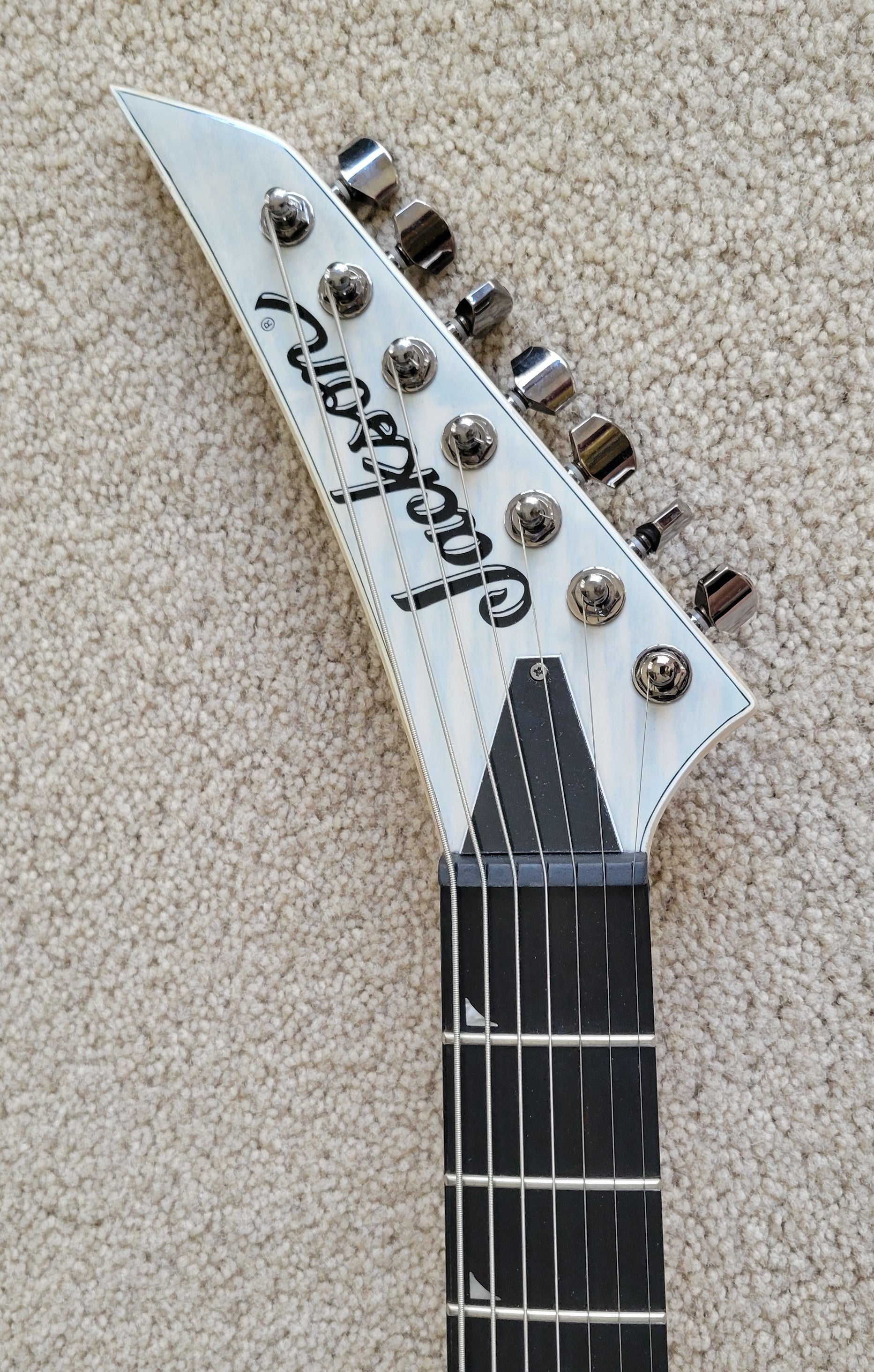 This guitar is a standout with its unique Unicorn White finish. The matching reverse Jackson pointed 7-in-line headstock, 2-ply black/celluloid pearl binding, and black nickel hardware combine to create a truly remarkable instrument.
