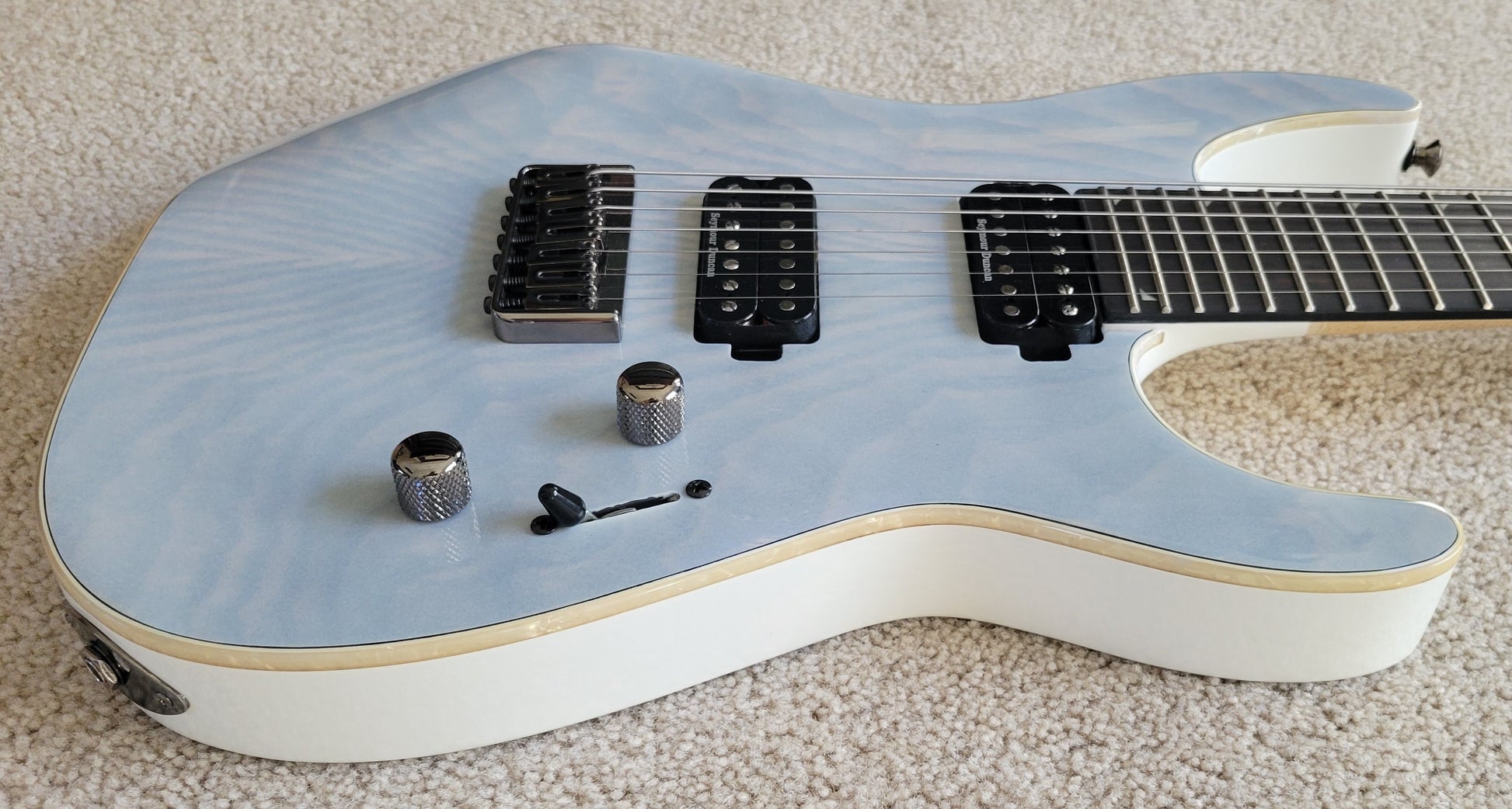 The 12"-16" compound radius bound ebony fingerboard is designed for highly technical, lightspeed playing. It's more curved by the nut for comfortable chording and flattens out as you move up the neck for increasingly fast playing speed and wide bends without fretting out.