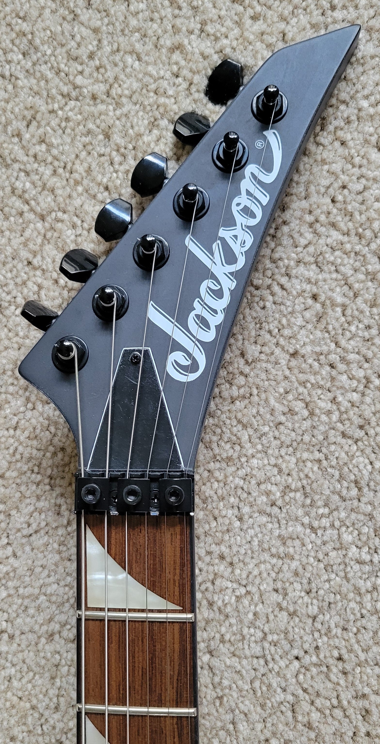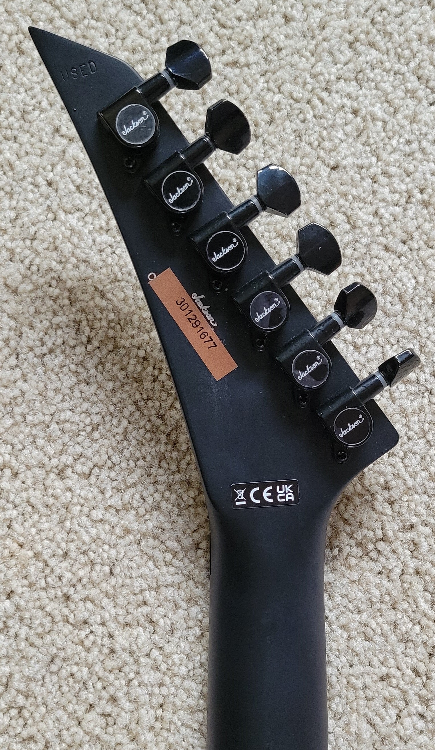 Cloaked in either Satin Black, this royal axe is finished off with a Jackson pointed 6-in-line black headstock and black hardware.