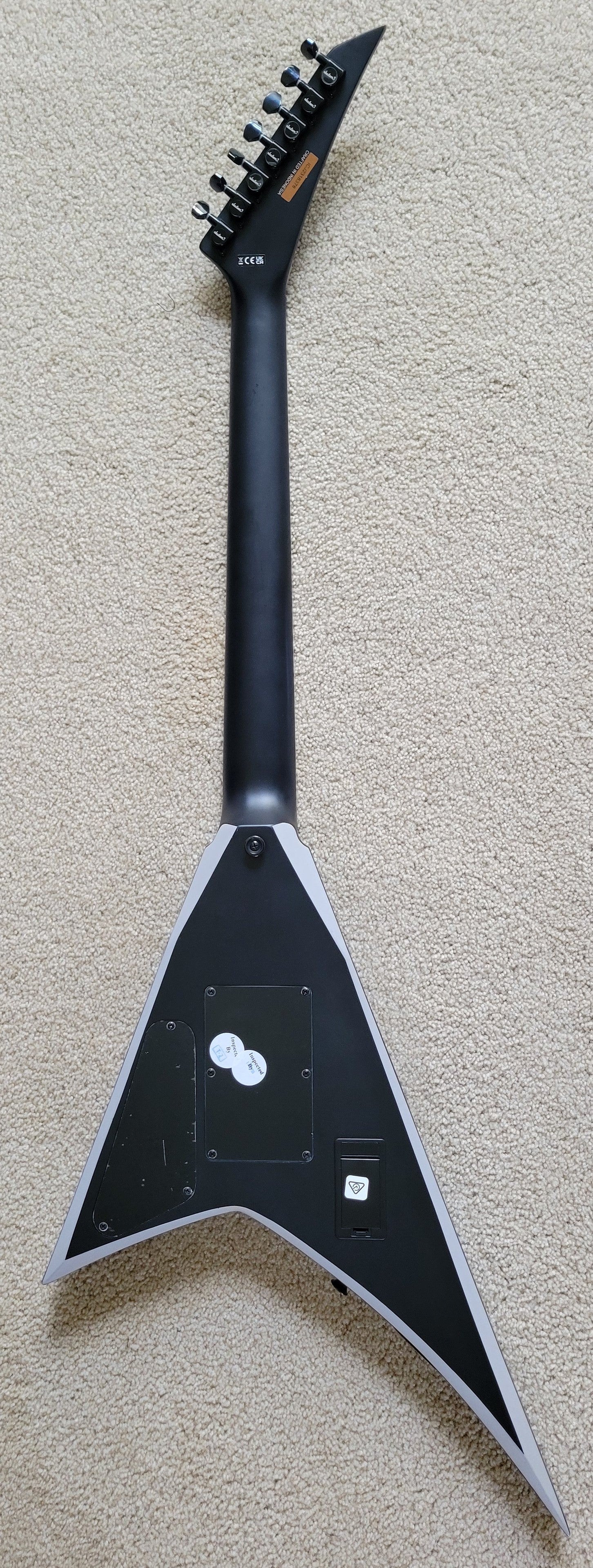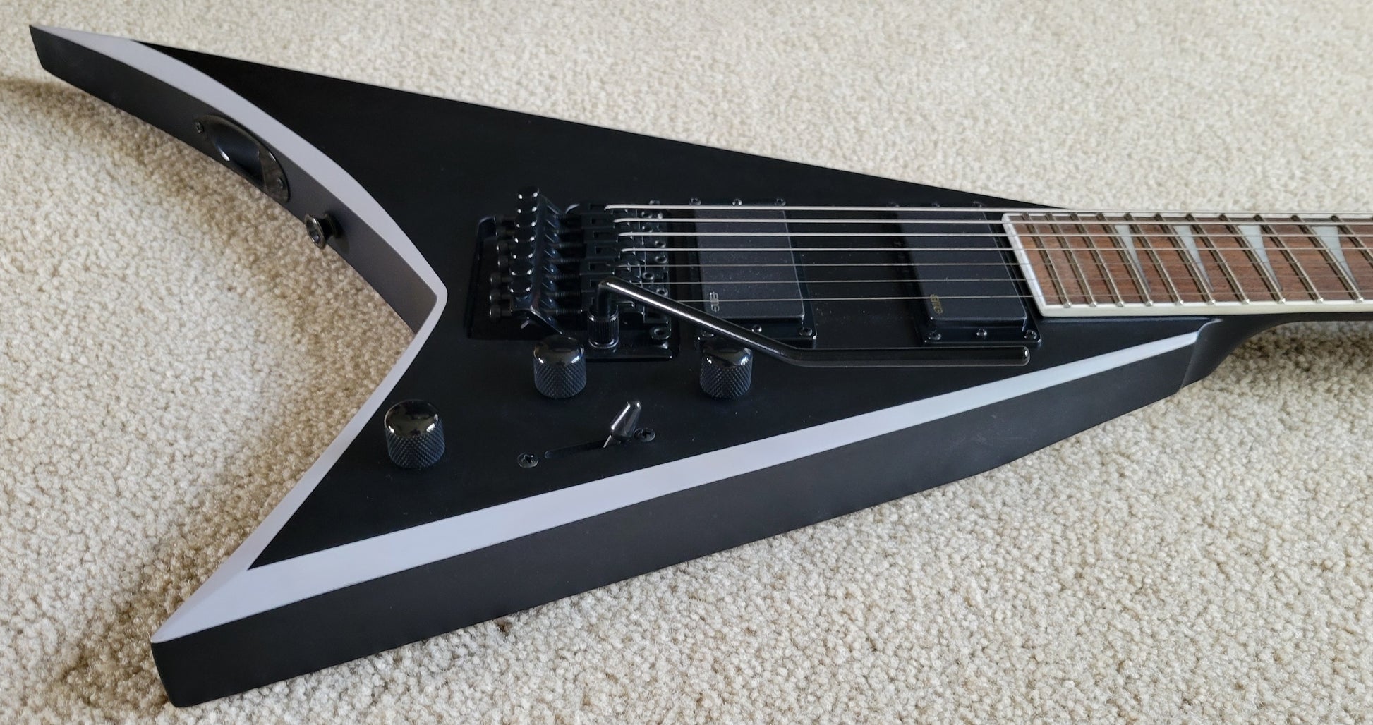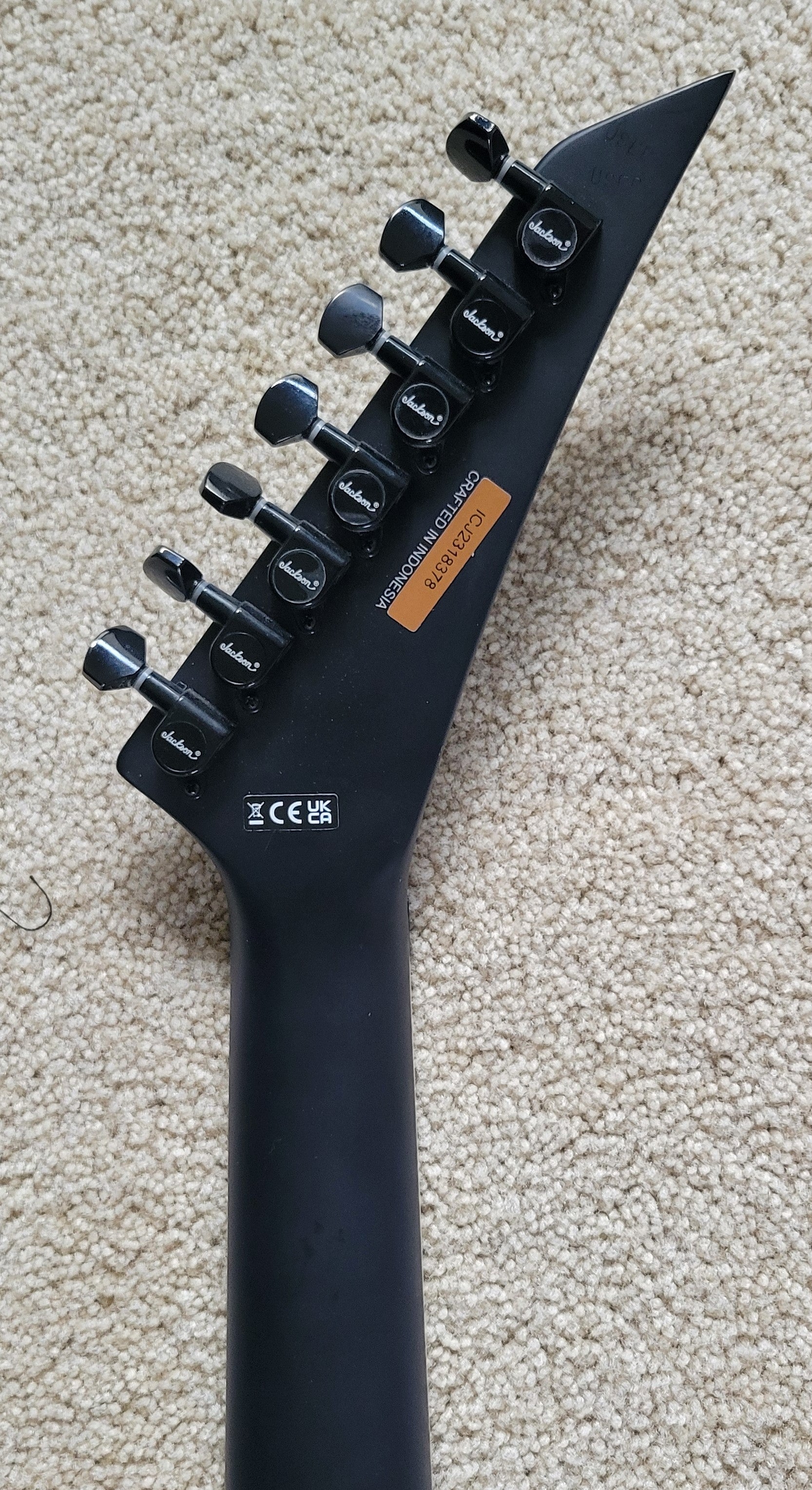 - Available in Satin Black with Primer Gray Bevels with reverse Jackson pointed 7-in-line black headstock and black hardware