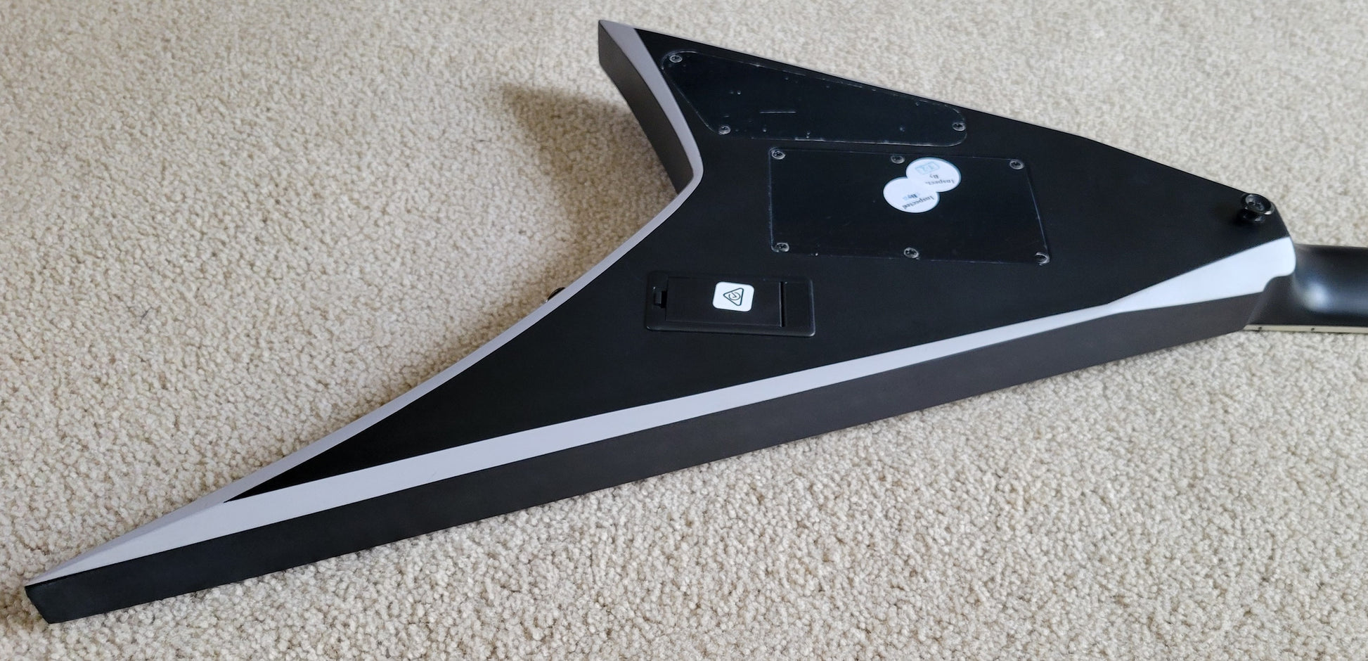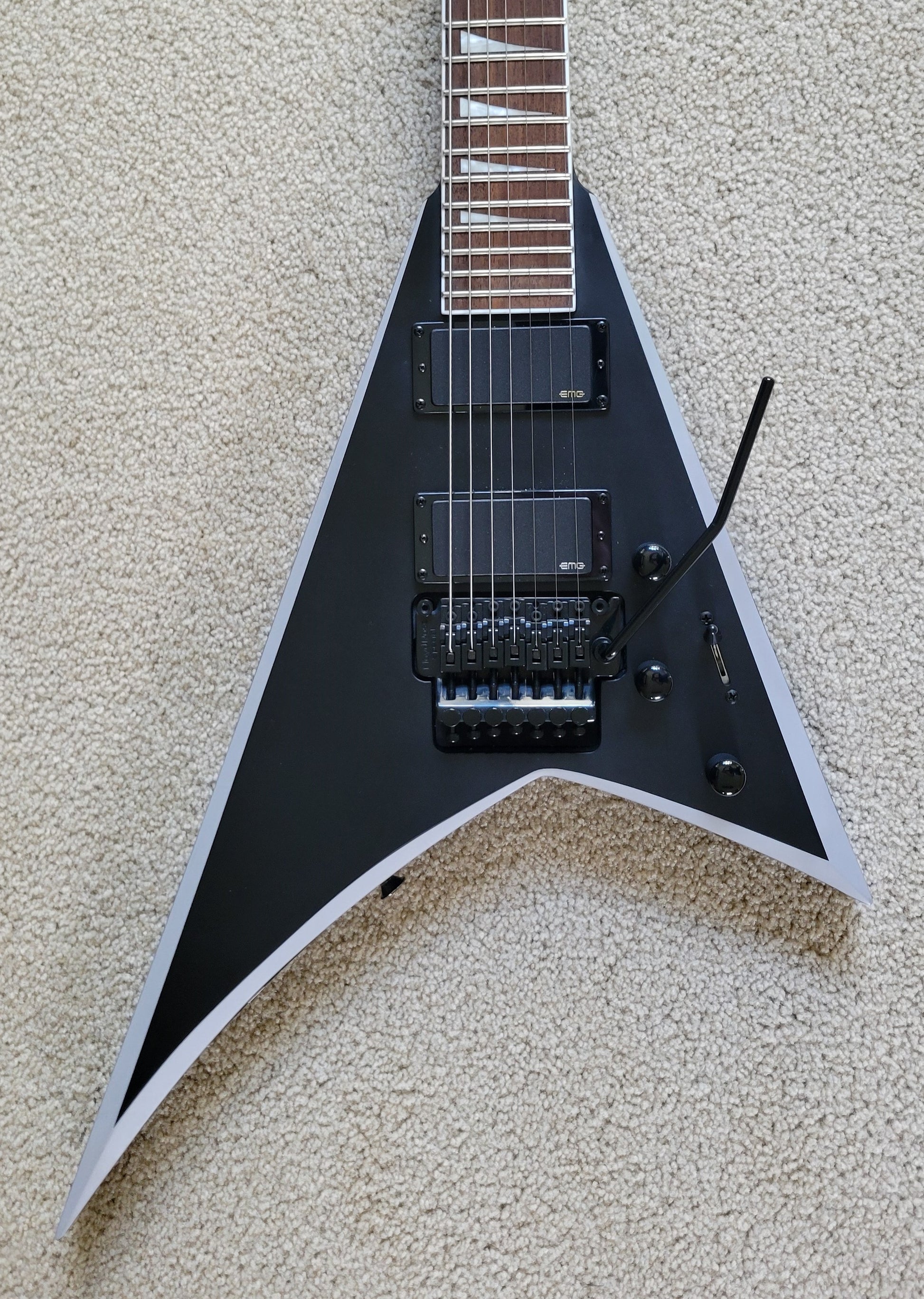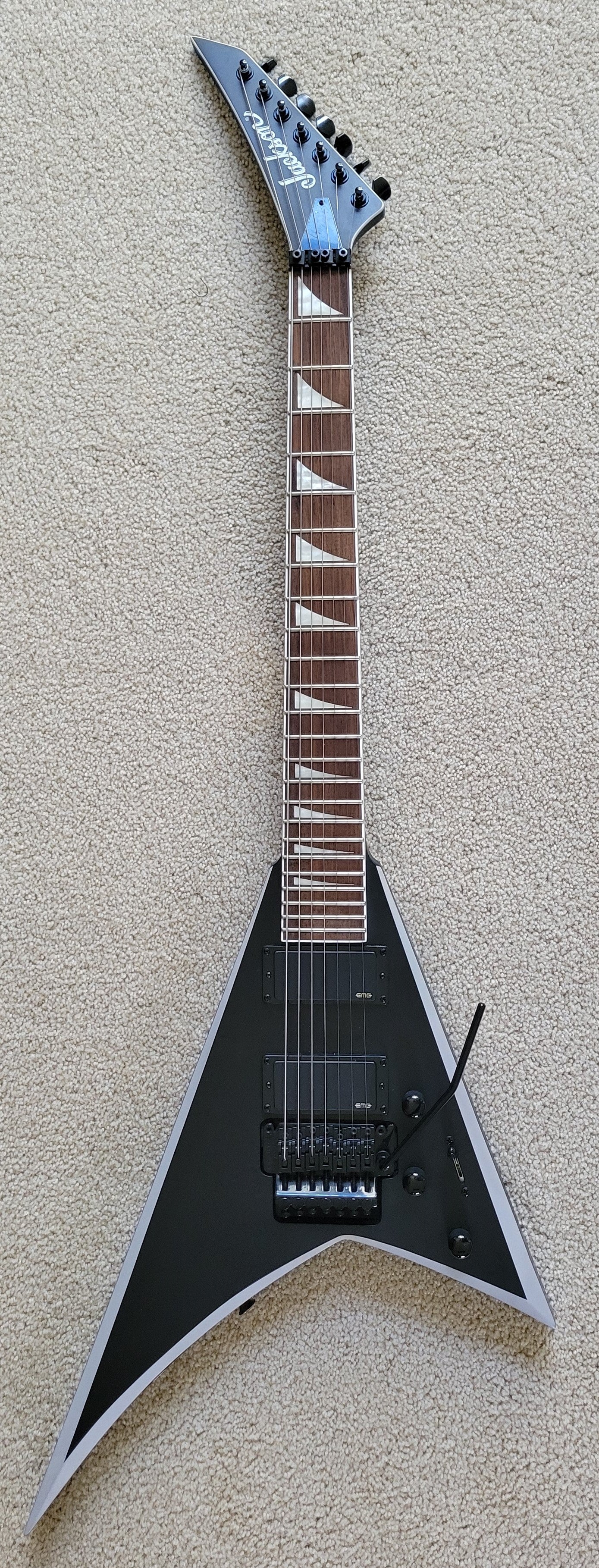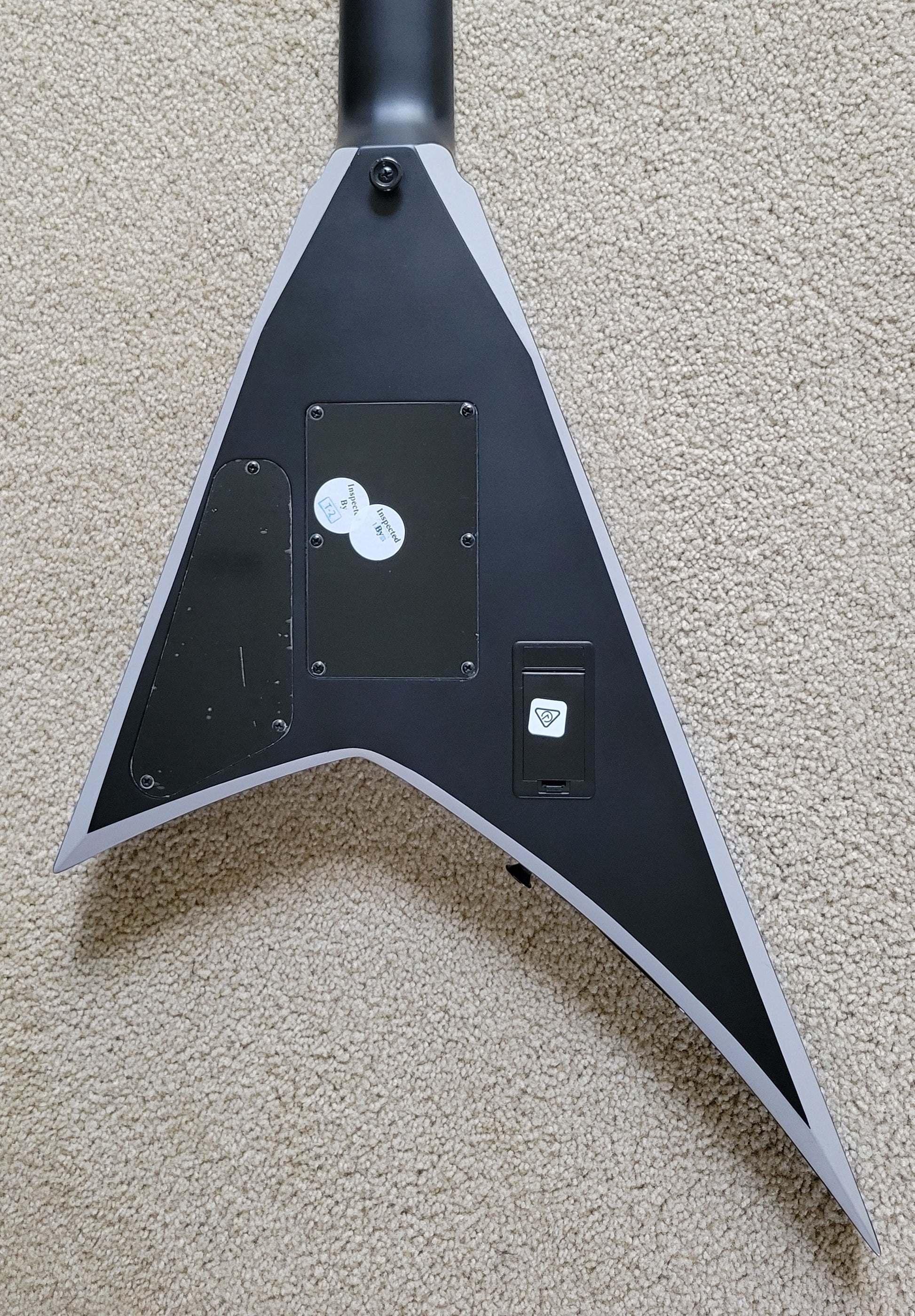 - Available in Satin Black with Primer Gray Bevels with reverse Jackson pointed 7-in-line black headstock and black hardware