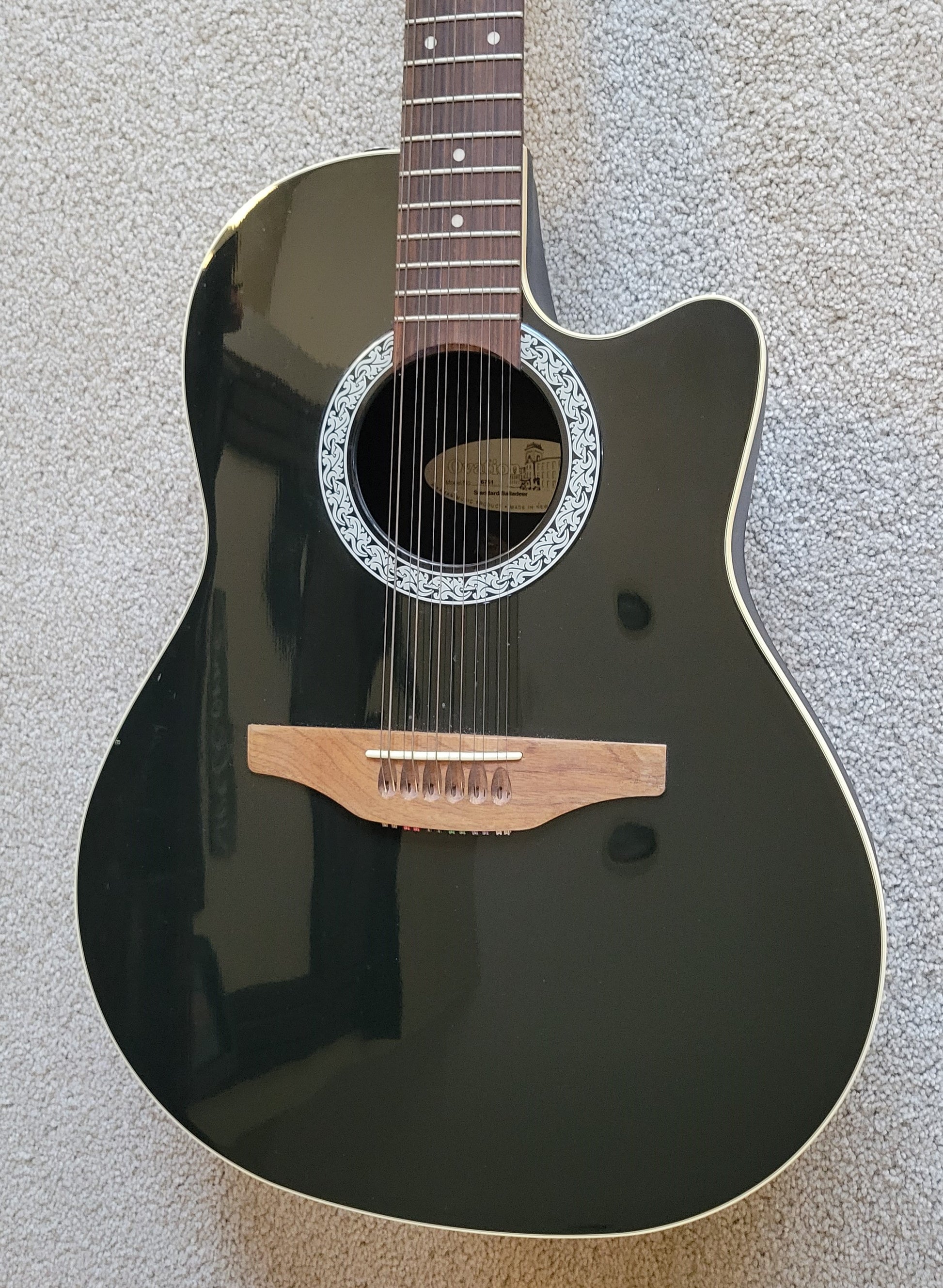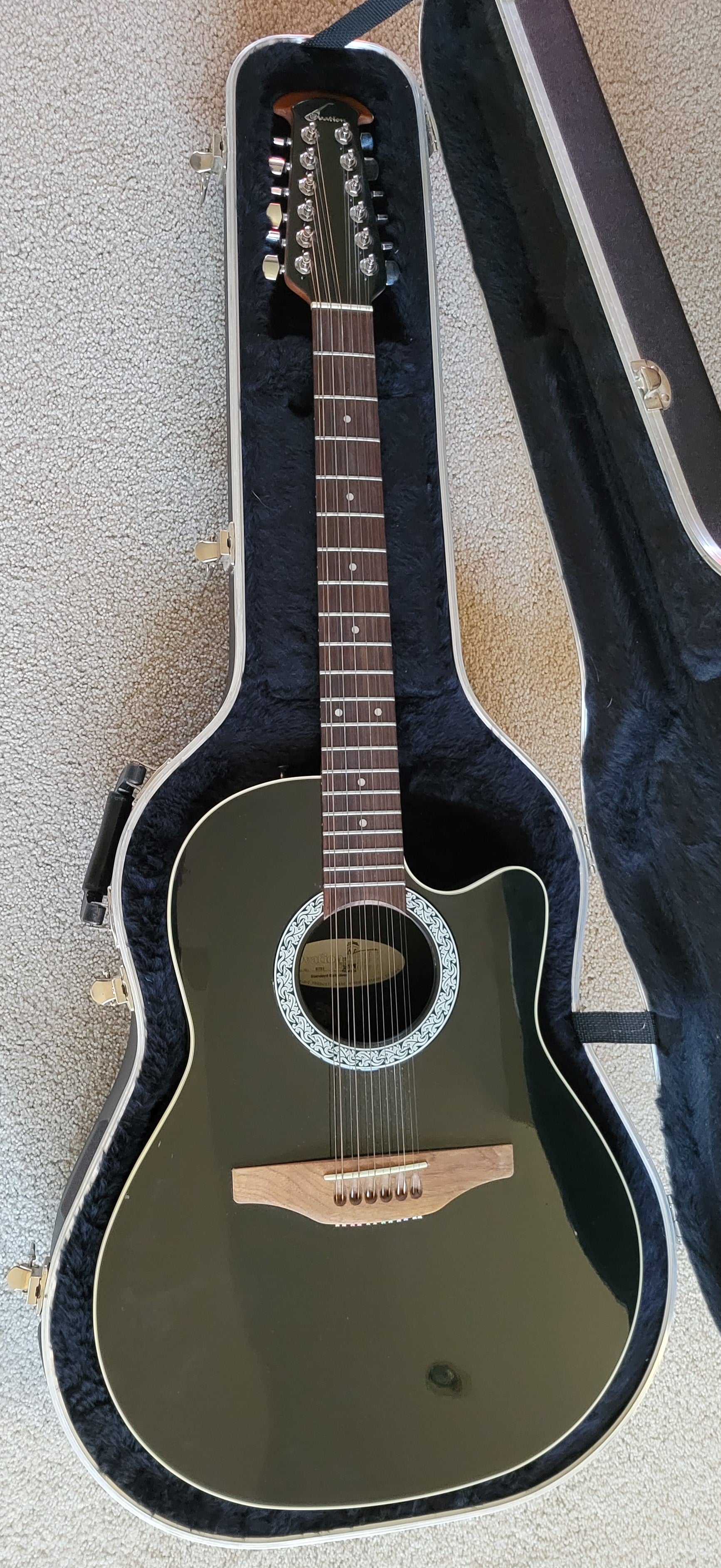 This is an Excellent Condition pre-owned/used Ovation USA 6751 Standard Balladeer 12 String Acoustic Electric Guitar available as shown and described. A Shiny Gloss Black Finish, and a platic molded Ovation hard shell case is included.