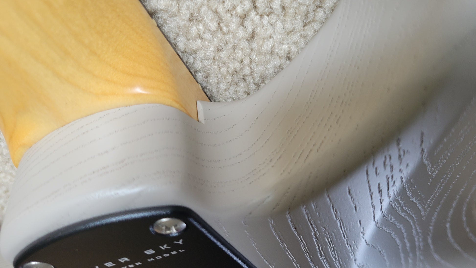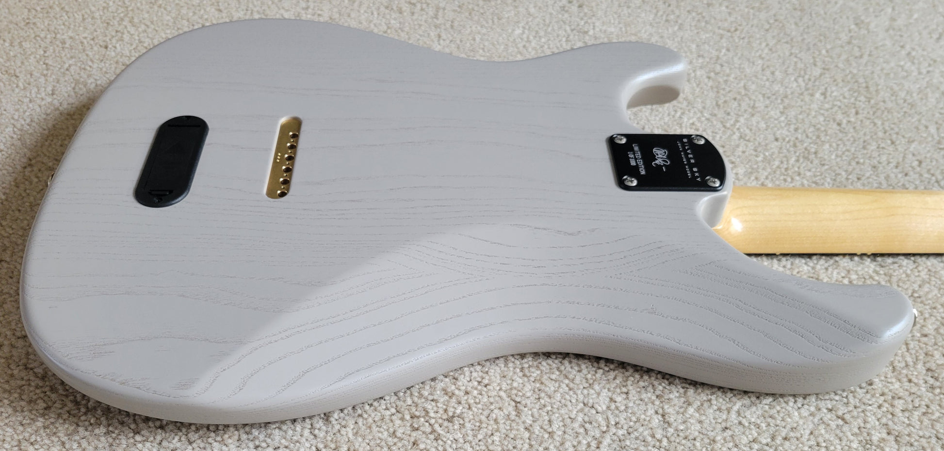 The foundation of the “Dead Spec” Silver Sky is a lightweight Swamp Ash body (rather than alder) finished in Moc Sand satin nitro that is thin and strikingly sinks into the ash wood grain. The bridge is a modified PRS patented Gen III Tremolo that has been screwed to the body, effectively rendering it a string-through hardtail bridge. Keeping the tremolo’s brass block in the equation adds a musical warmth to the guitar. At the other end of the strings are a brass nut and string retainer bar, which also contribute to the guitar’s resonance and tone.