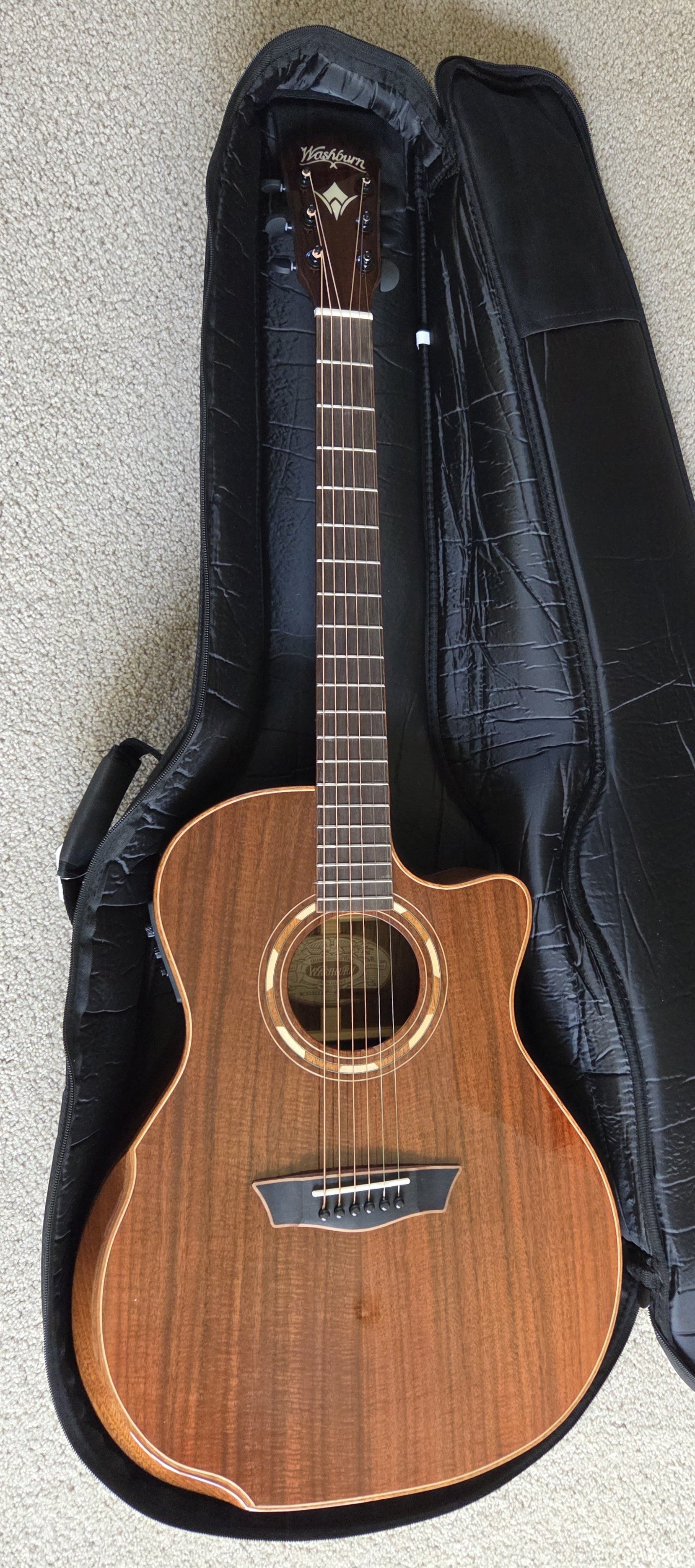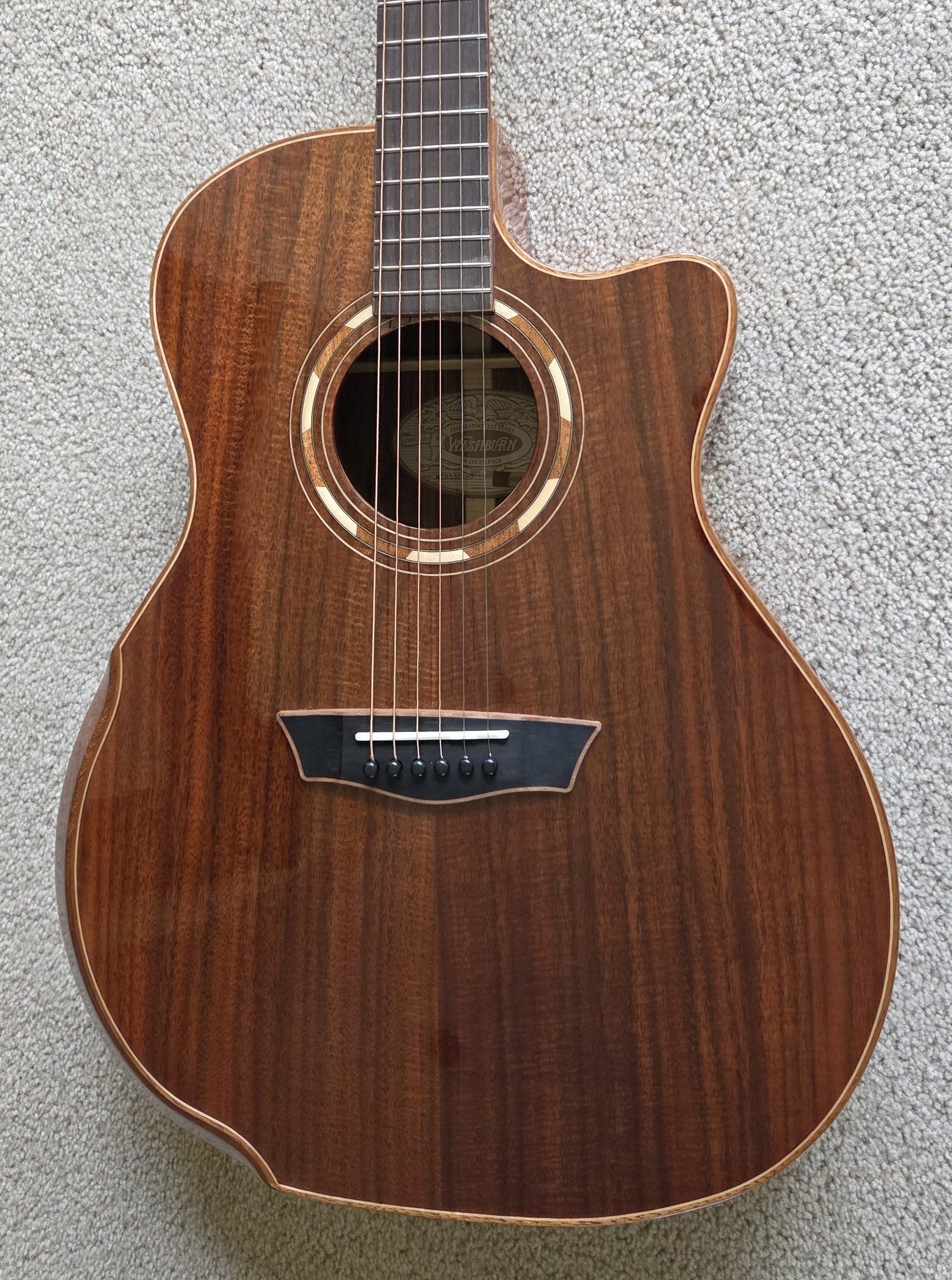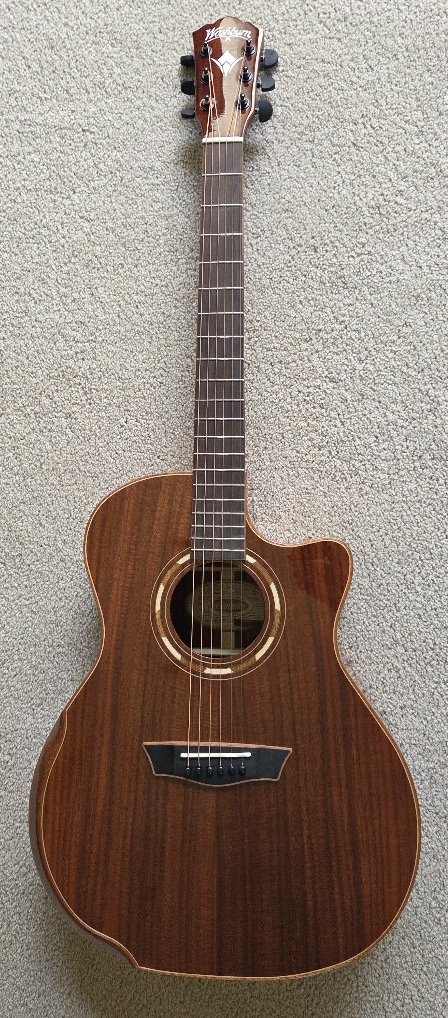 This EXCELLENT guitar went from Washburn to their authorized refurbisher MIRC, where it received a full multi-point inspection and expert setup - it is ready to play! There is a small ding on the lower backside that has been filled/sealed - see the photos. No other visible repairs were necessary, and no modifications were made except the back of the headstock was stamped USED, and the original serial number was replaced with a new one.