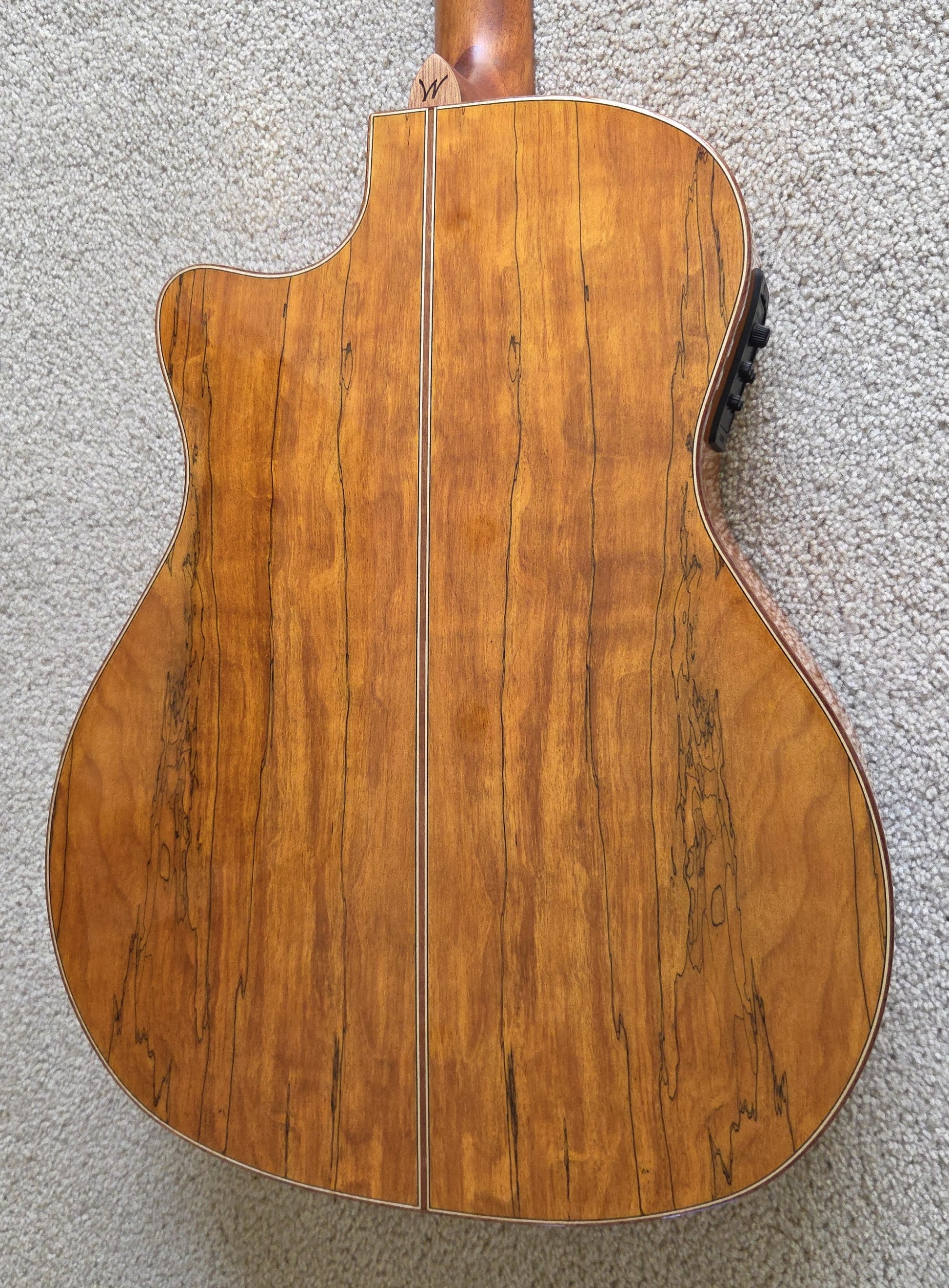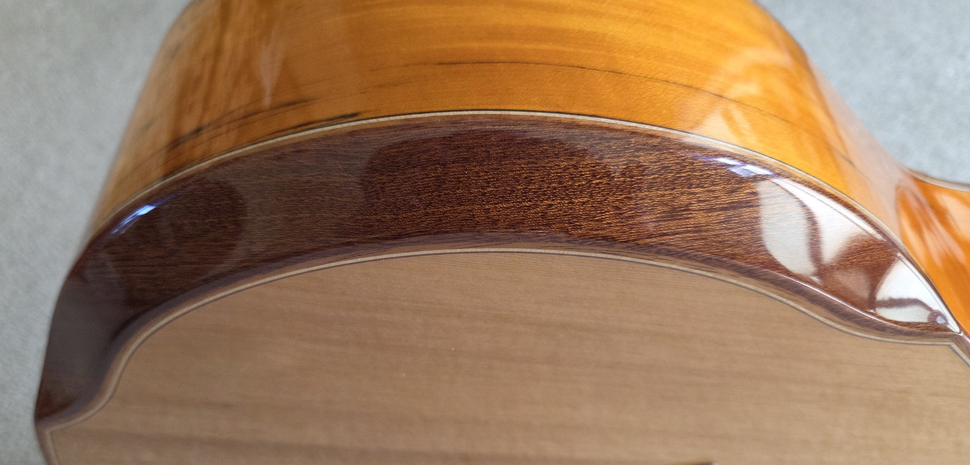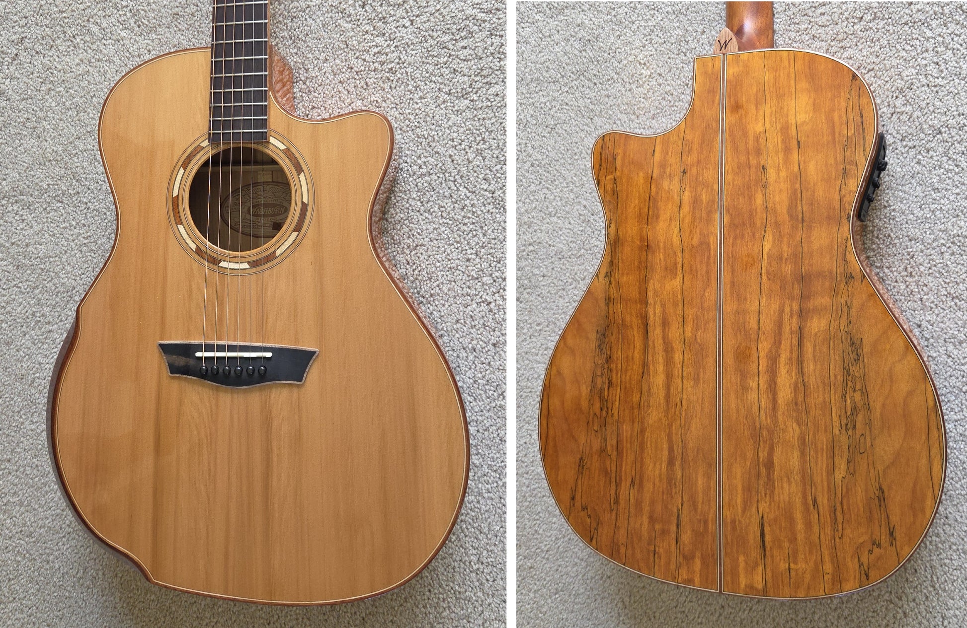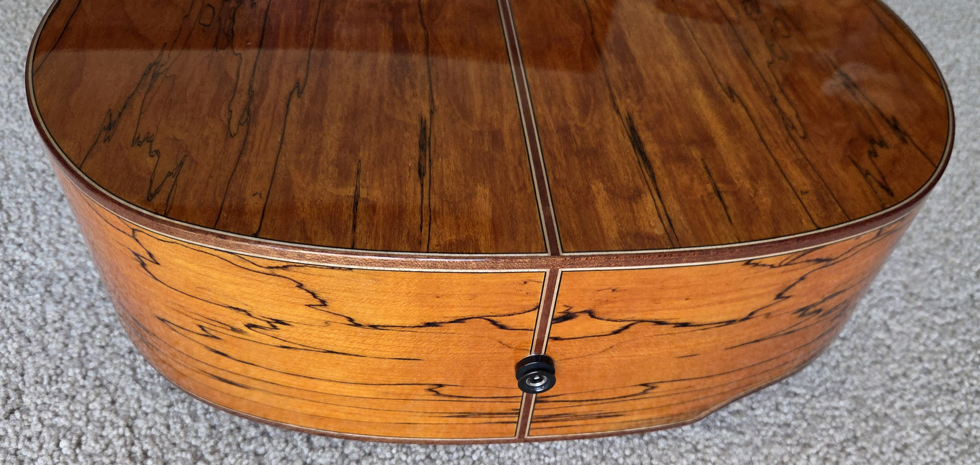 A solid Canadian Western Red Cedar soundboard with Spalted Maple body results in a unique and spectacular guitar. Tonally the warmth of Cedar and the focus of maple produces a well balanced, elegant, and distinctive voice.