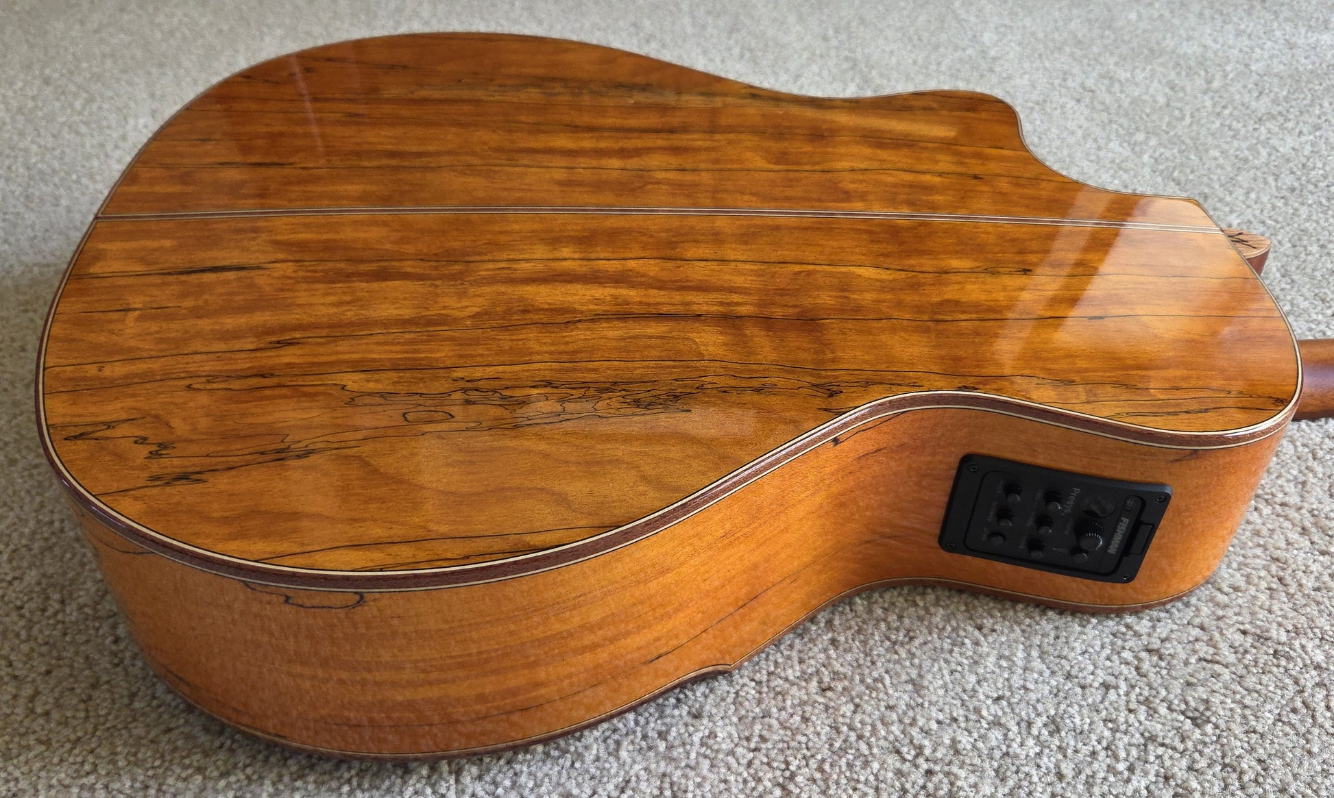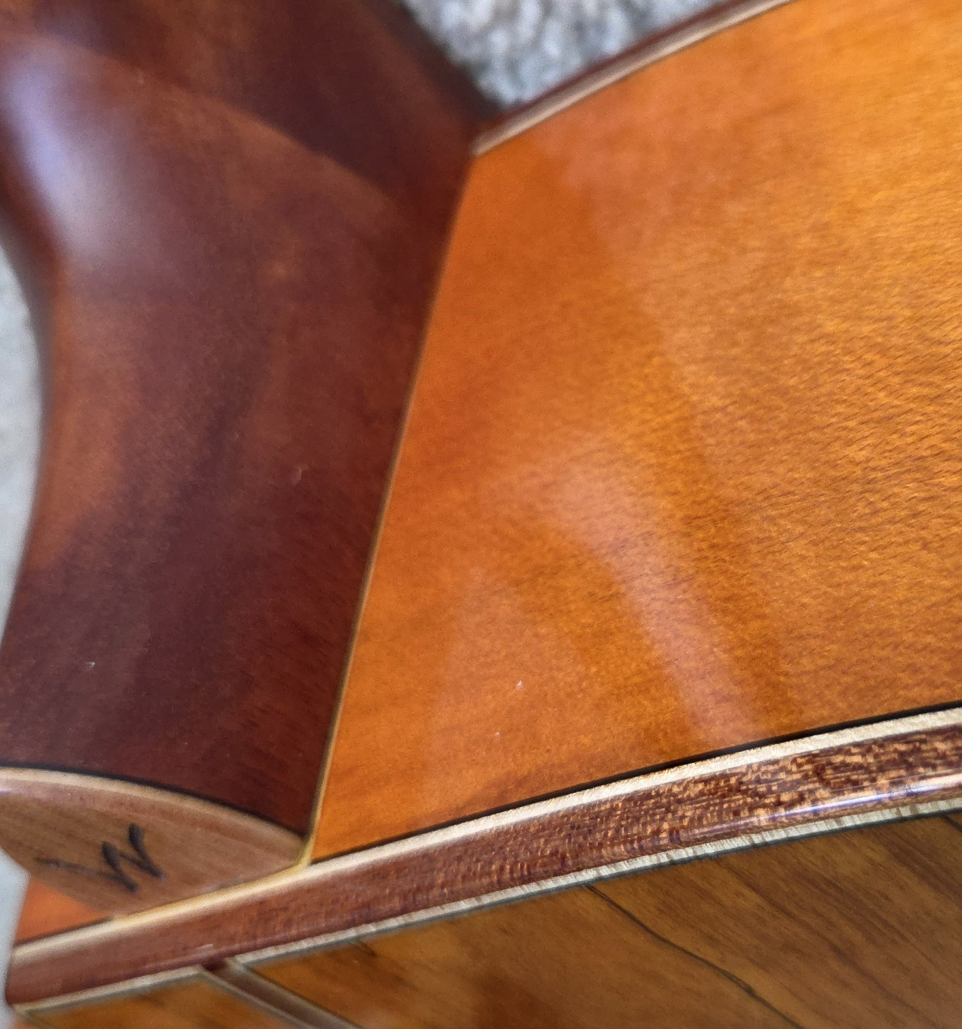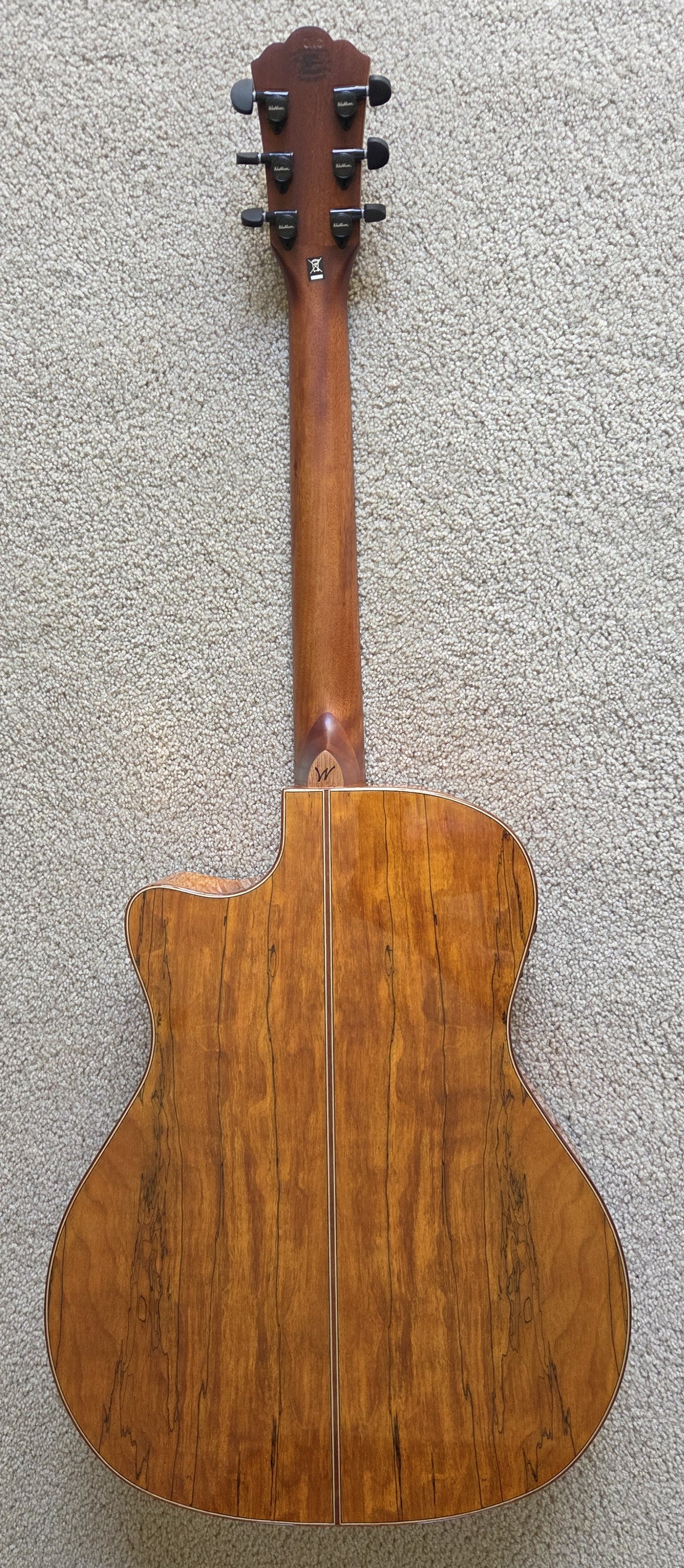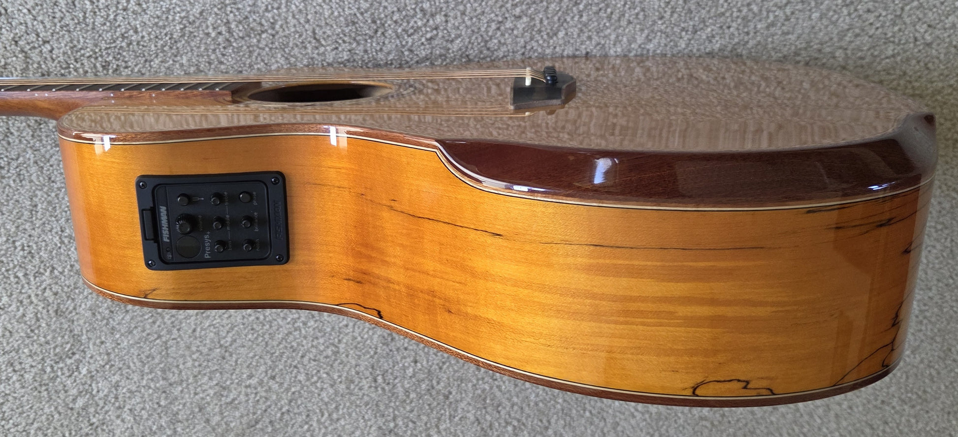 A solid Canadian Western Red Cedar soundboard with Spalted Maple body results in a unique and spectacular guitar. Tonally the warmth of Cedar and the focus of maple produces a well balanced, elegant, and distinctive voice.