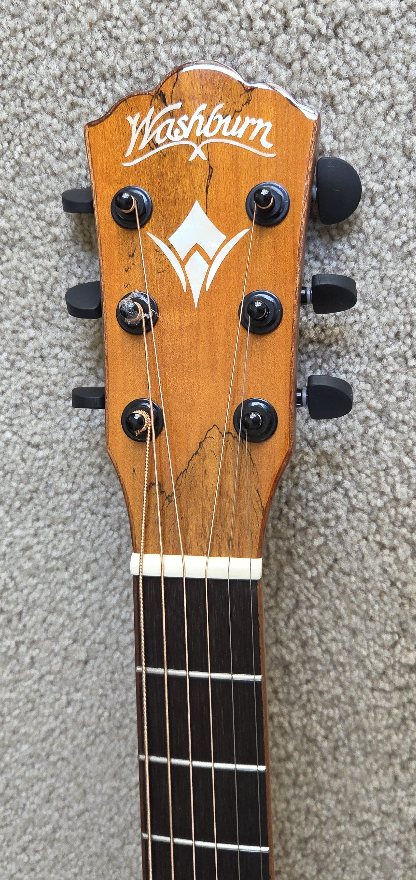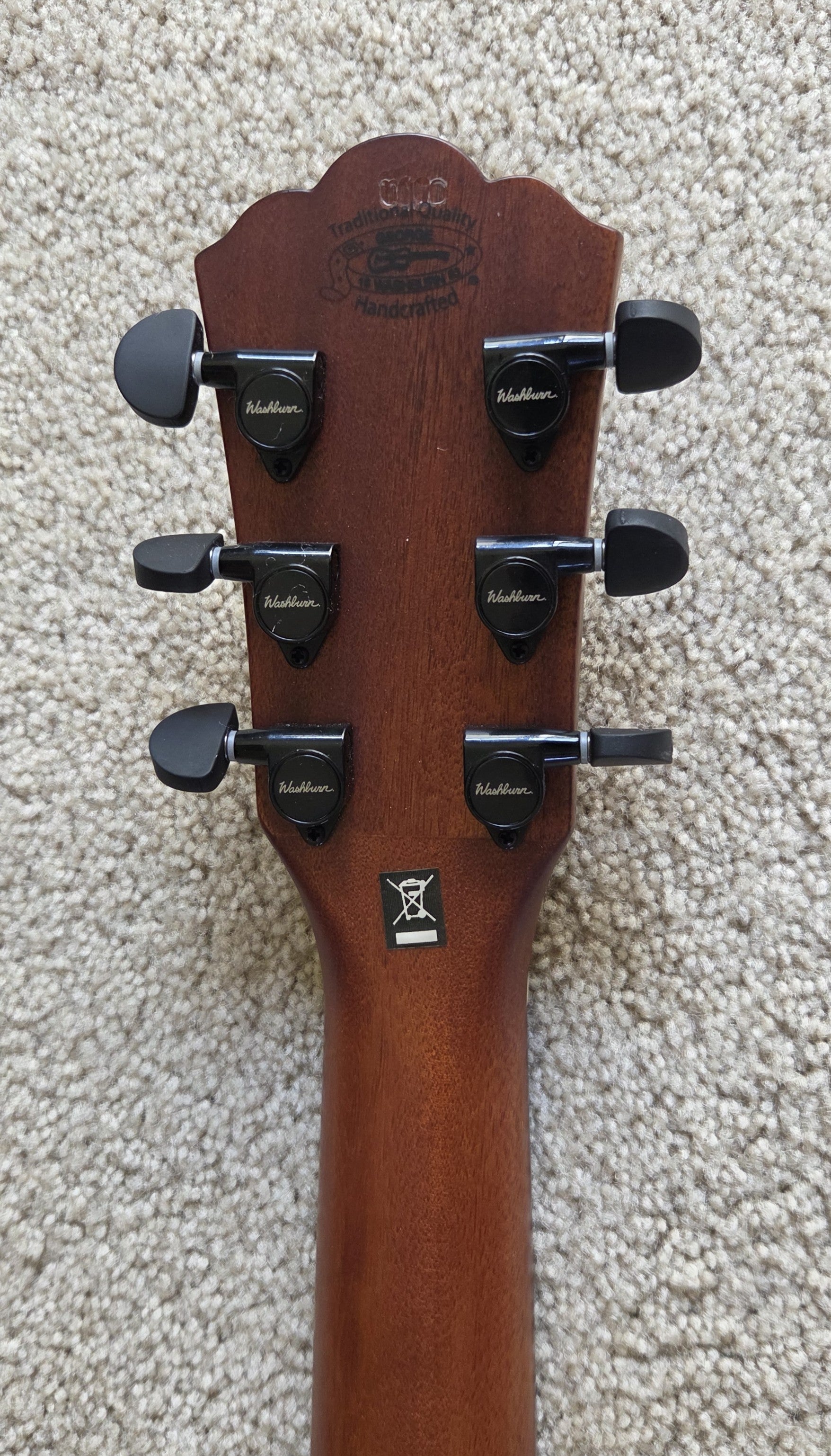 This LIKE NEW guitar went from Washburn to their authorized refurbisher MIRC, where it received a full multi-point inspection and expert setup - it is ready to play! A new set of strings might be helpful, but no visible repairs were necessary, and no modifications were made except the back of the headstock was stamped USED and the original serial number was replaced/covered with a new one.